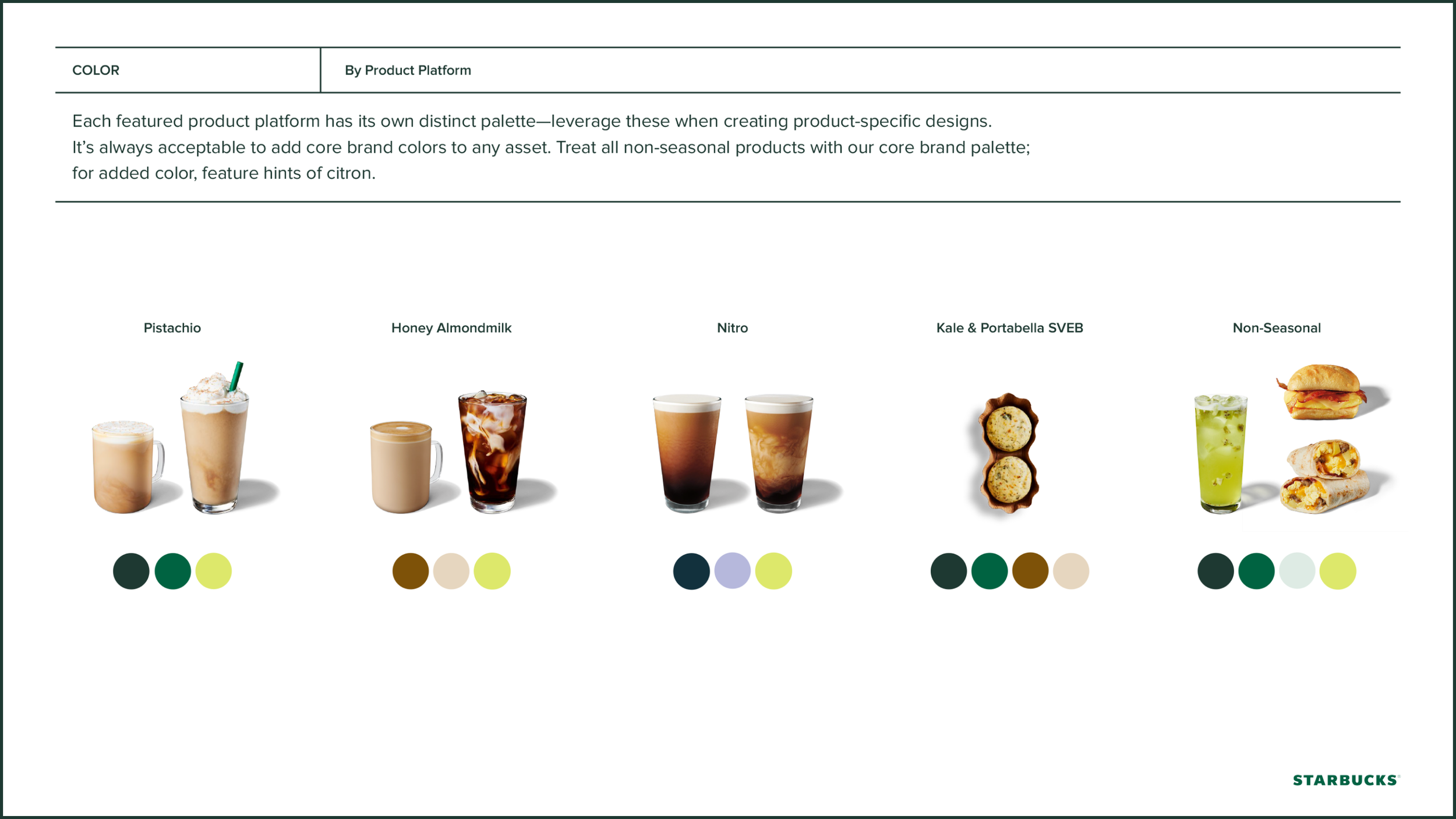 The Starbucks Creative Studio owns the look and feel for all customer-facing promotional campaigns. Each expression is informed by a strategic marketing brief, features a seasonal product array, and is rooted in the core brand.